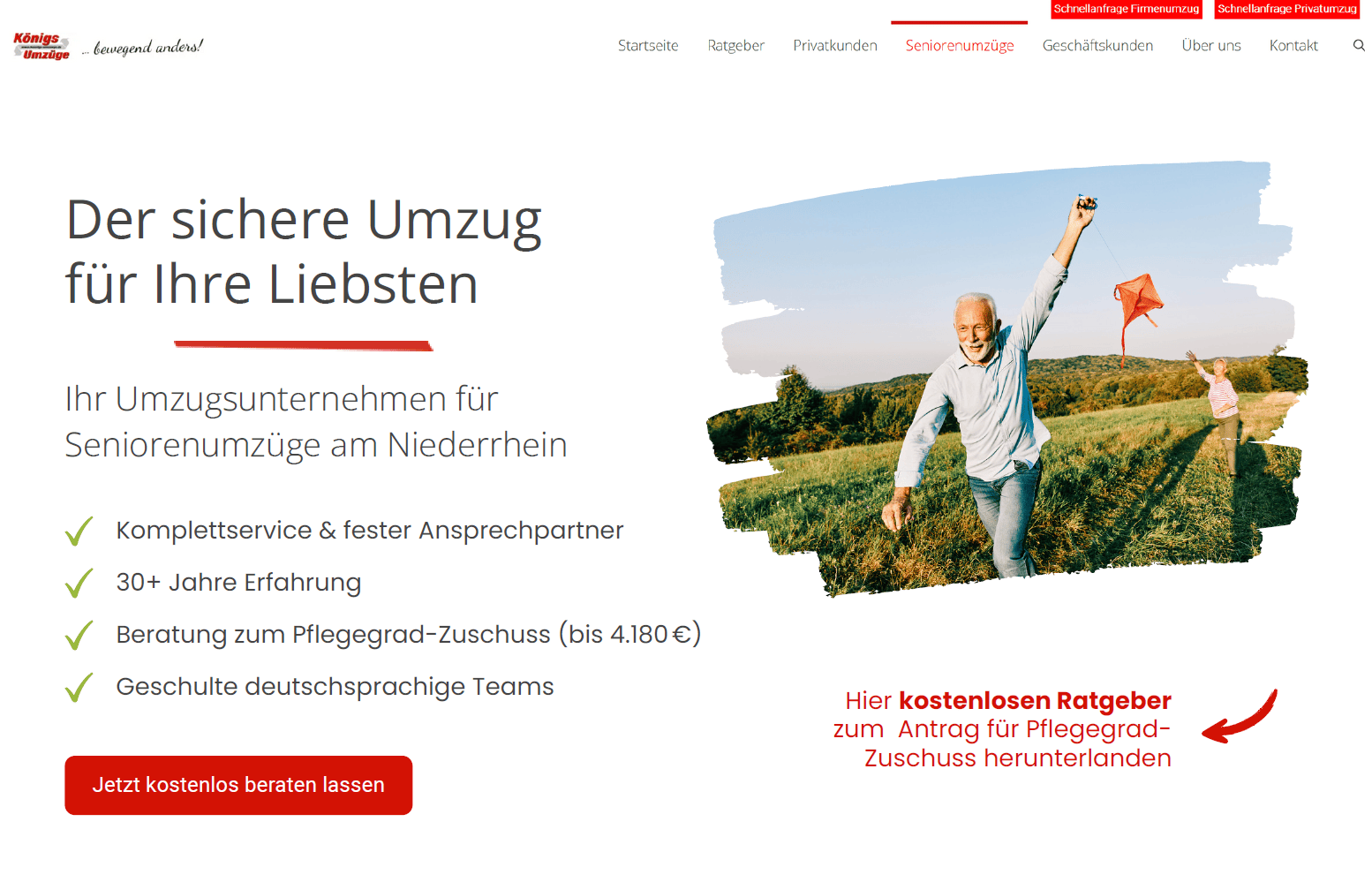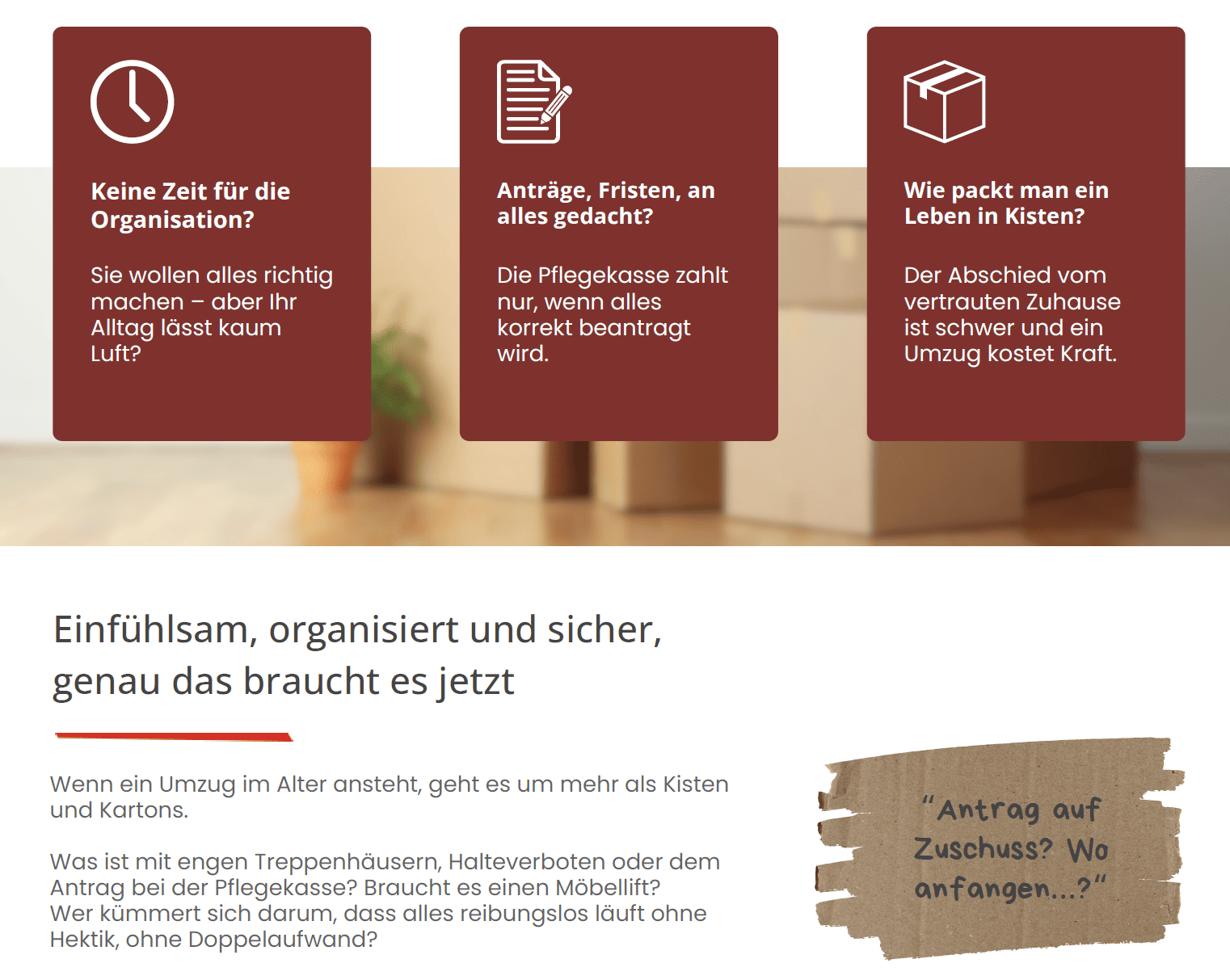 Durch die neue Landingpage für Seniorenumzüge hat das Unternehmen ein zentrales Ziel für Online Kampagnen und Offline Maßnahmen erhalten. Interessenten finden dort alle relevanten Informationen, verstehen den Nutzen eines Full Service Umzugs mit Pflegegrad Zuschuss und werden gezielt zur Kontaktaufnahme geführt. Gleichzeitig hat die Kundin nun Klarheit über den Status der Website und einen klaren Fahrplan, wie weitere Marketingmaßnahmen sinnvoll aufeinander aufbauen können.