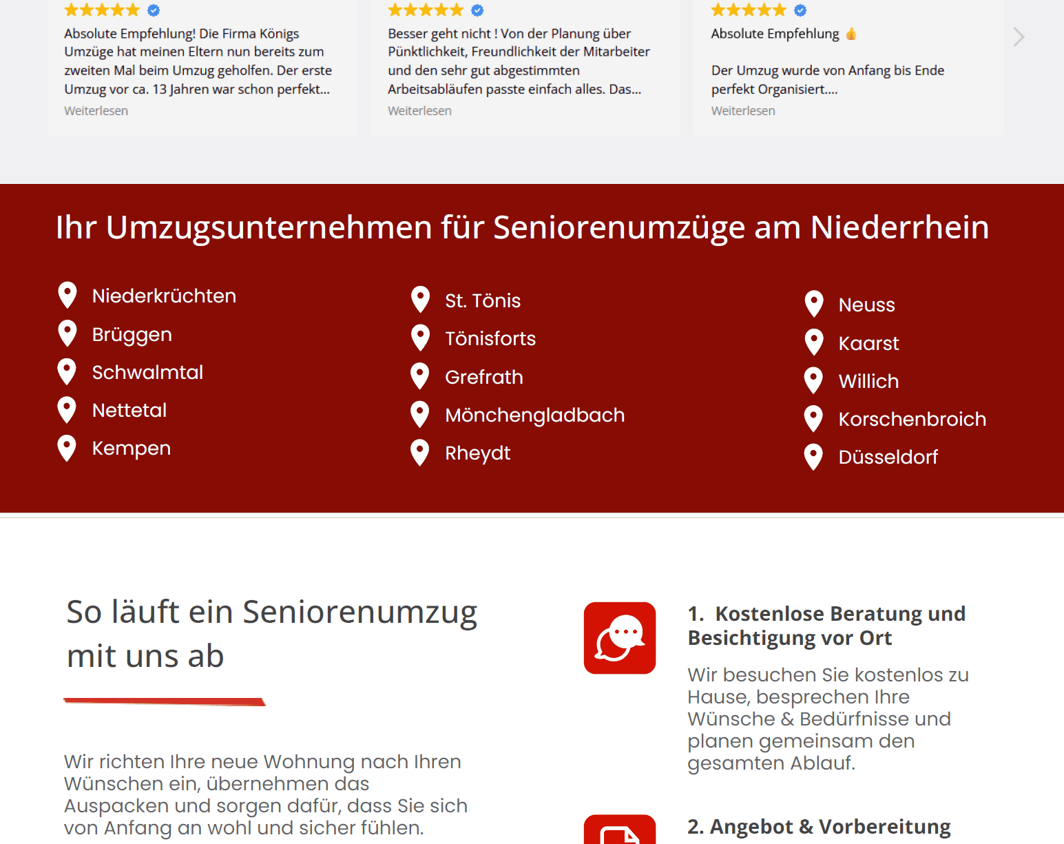 Parallel dazu integrierten wir lokale Suchbegriffe gezielt in Struktur und Inhalte, etwa in Überschriften, Fließtexte und Meta Daten. So wird für Suchmaschinen klarer, in welchen Regionen Königs Umzüge aktiv ist und für welche Leistungen das Unternehmen gefunden werden soll.
